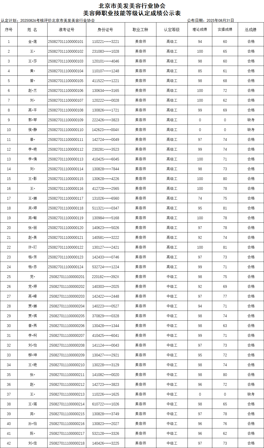 2025 年8月美发师、美容师职业技能等级认定考核成绩已于 2025 年 8月 31日公布,成绩复核申请时间为2025 年 8 月 31日至 9月 6 日(共 7 天)。如对本人成绩有异议,请在规定时间内联系我们提交复核申请。
