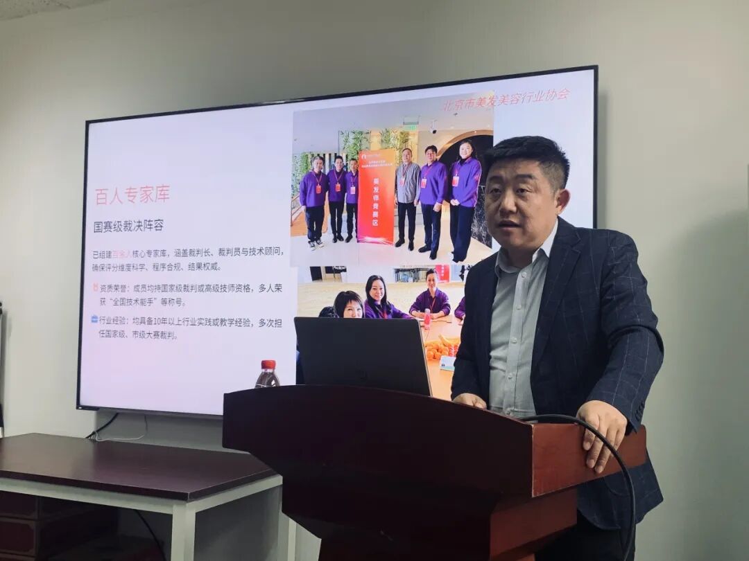 遴选现场,北京市美发美容行业协会秘书长李剑勇代表协会上台,围绕美发师、美容师项目核心维度展开申报陈述。他结合当前美发美容行业发展趋势与市场需求,阐述项目申报必要性;介绍协会过往赛事经验、资源储备及项目覆盖规模,展现落地保障能力;提及项目专家团队资历,强调专业支撑;同时分享赛事创新形式与宣传推广计划,凸显项目特色与行业价值。